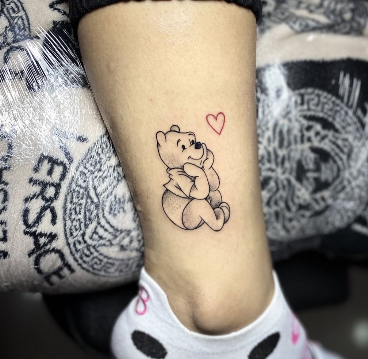 To keep this small, meaningful design looking fresh, ask your artist for soft dotwork shading on Pooh and a solid, fully saturated heart so the color doesn’t fade too quickly. This style works beautifully on ankles or calves, especially if you like to wear cropped jeans or sneakers that show just a peek of ink. A thin layer of unscented moisturizer and a good sunscreen will help preserve the fine line detail and that tiny heart for years.
