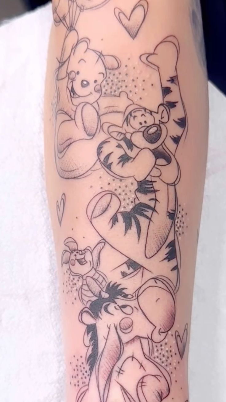 Here, Pooh, Piglet, Tigger, and Eeyore are practically little framed portraits, with each splattered in watercolor bursts made to look hand-painted. The effect is flirty but strangely chic—like you gave your favorite childhood friends a minimalist gallery wall treatment on your arm. It’s one of those Winnie the Pooh tattoo ideas that crosses between nostalgia and grown-up taste, which is ideal if you spend your days in blazers and your nights in leggings.