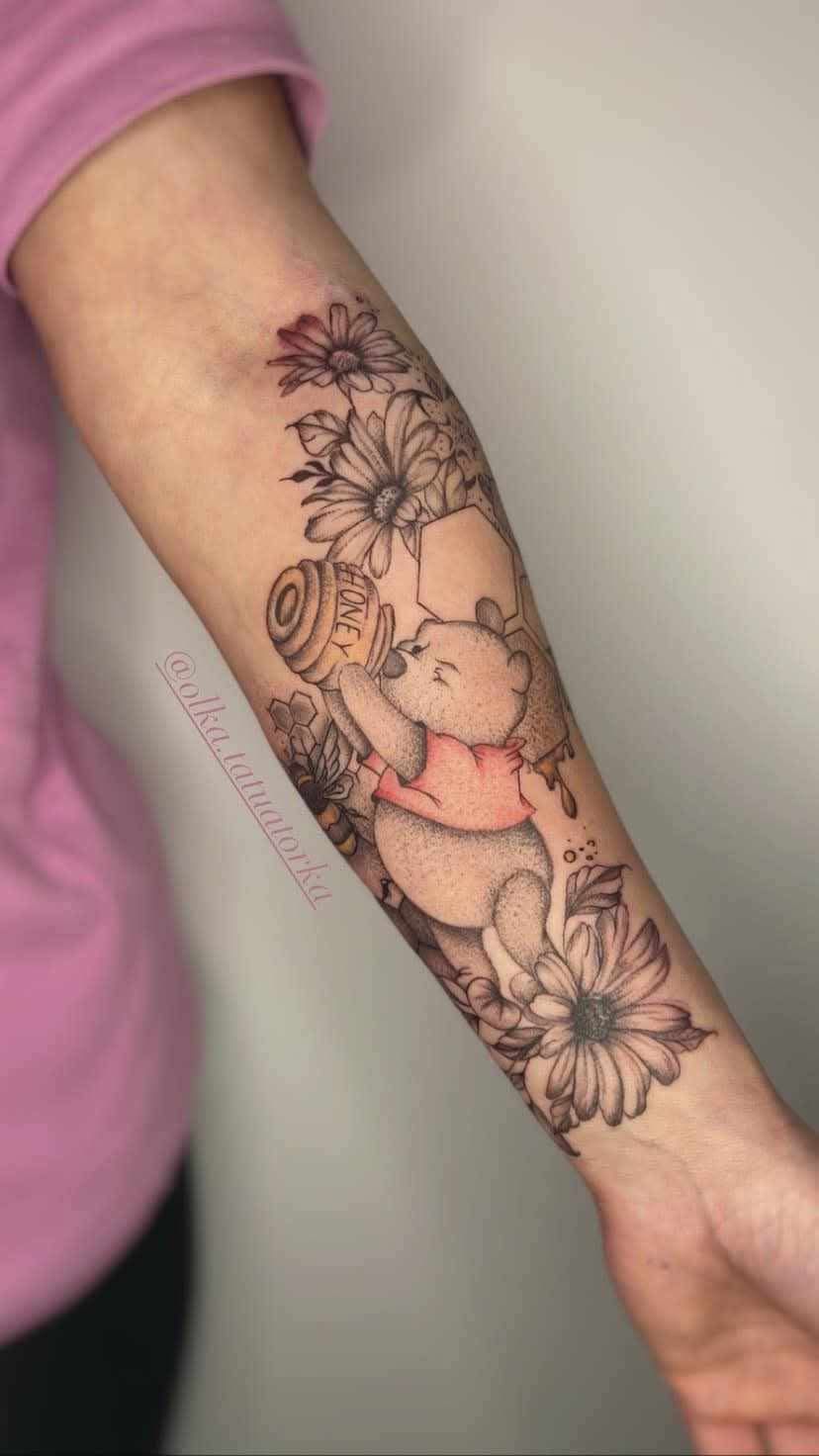 17. Floral Honey Pot Winnie the Pooh Forearm Tattoo