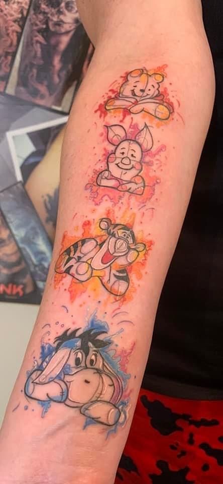 9. Watercolor Winnie the Pooh Character Stack Tattoo