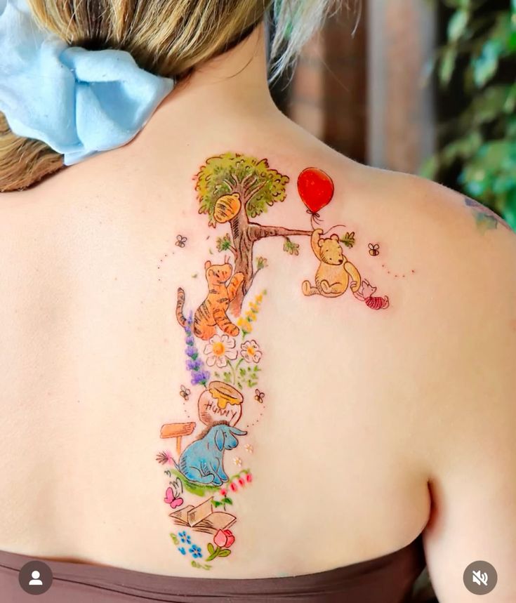 This lovely back piece looks like you’ve peeled a page from your favorite childhood book and let it unfold across your shoulder blades. Pooh, Tigger, Piglet, and Eeyore romp around a tree, a bright balloon floating above them, as flowers, books, and tiny picture details flow down the spine. It’s whimsical without losing its elegance, like a vintage watercolor poured over your skin, and it instantly communicates to the world that you still believe in gentle joy, even on (grown-up) Mondays.