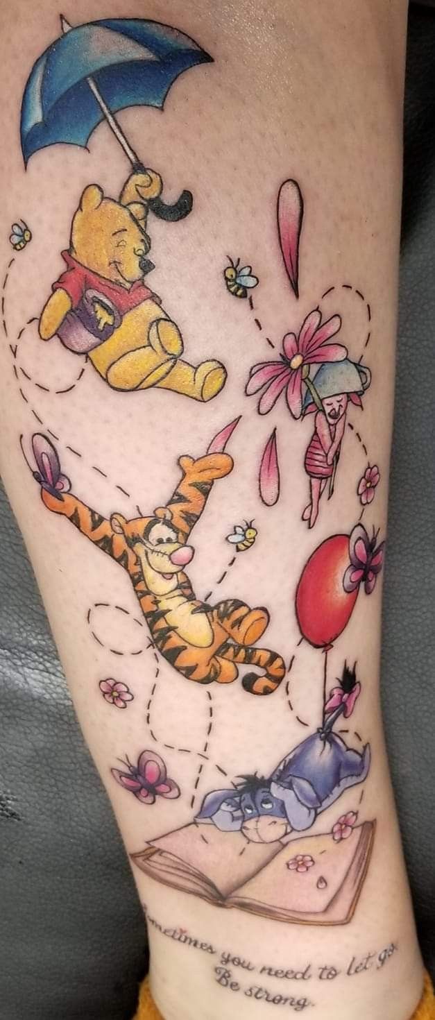 In 2026, larger narrative tattoos like this are a big trend, especially for people building a cohesive sleeve or calf panel. This design works beautifully as the centerpiece of a Disney-inspired sleeve, leaving space for extra characters like Roo or even a honey pot tucked elsewhere. Because there’s so much color and movement, choose an artist confident with layered designs and smooth blends so the whole piece feels intentional rather than busy, and plan for a couple of sessions to let your skin rest between passes.