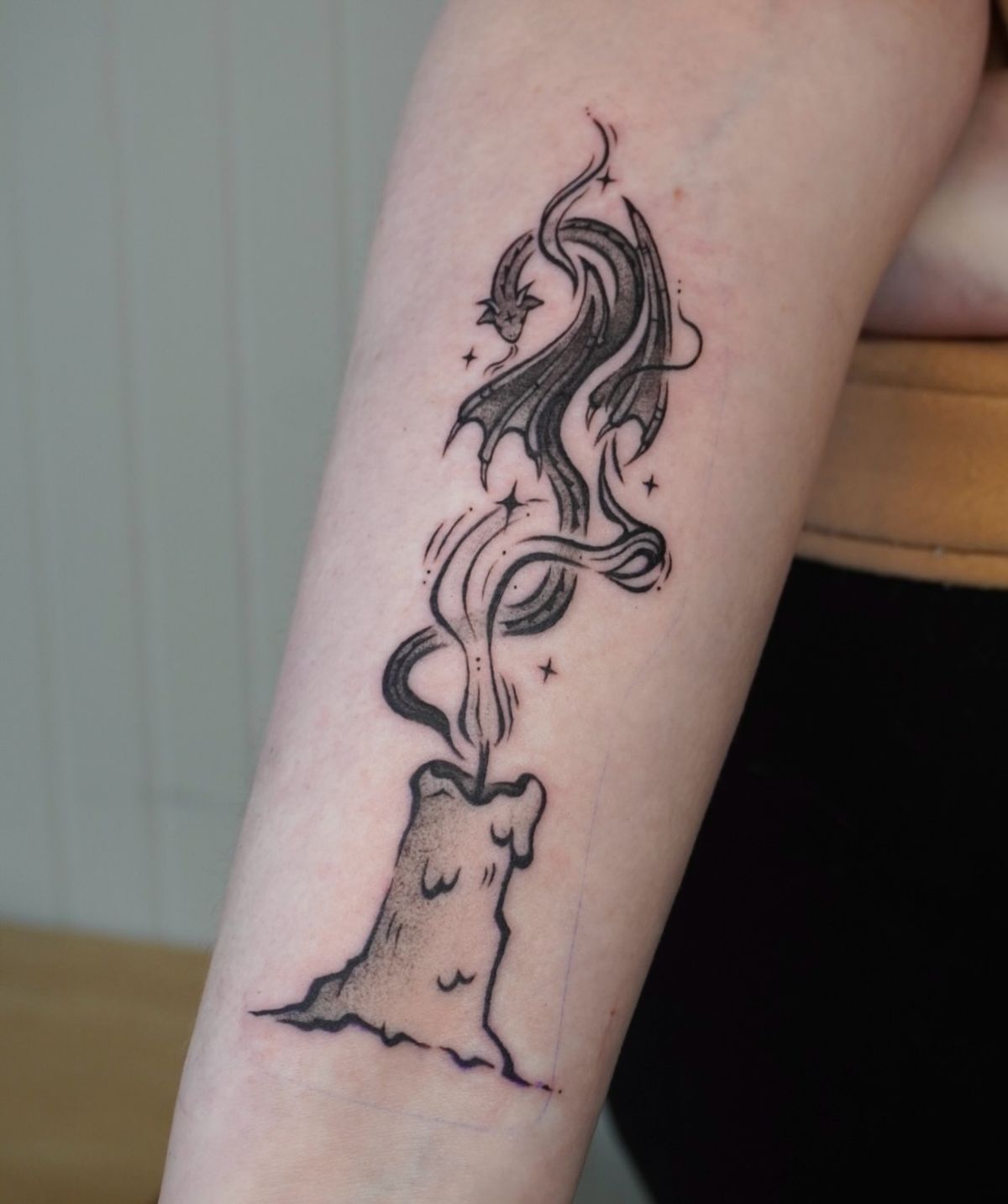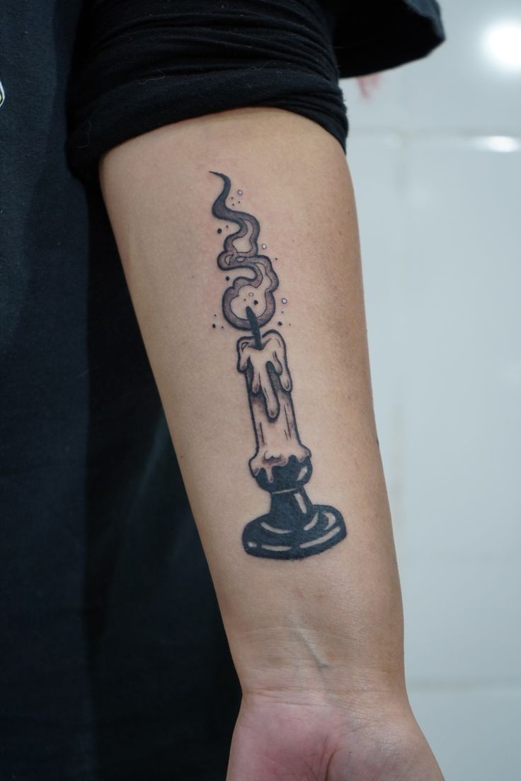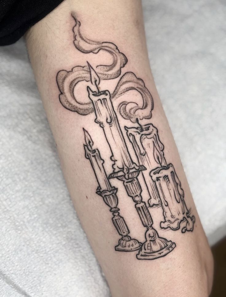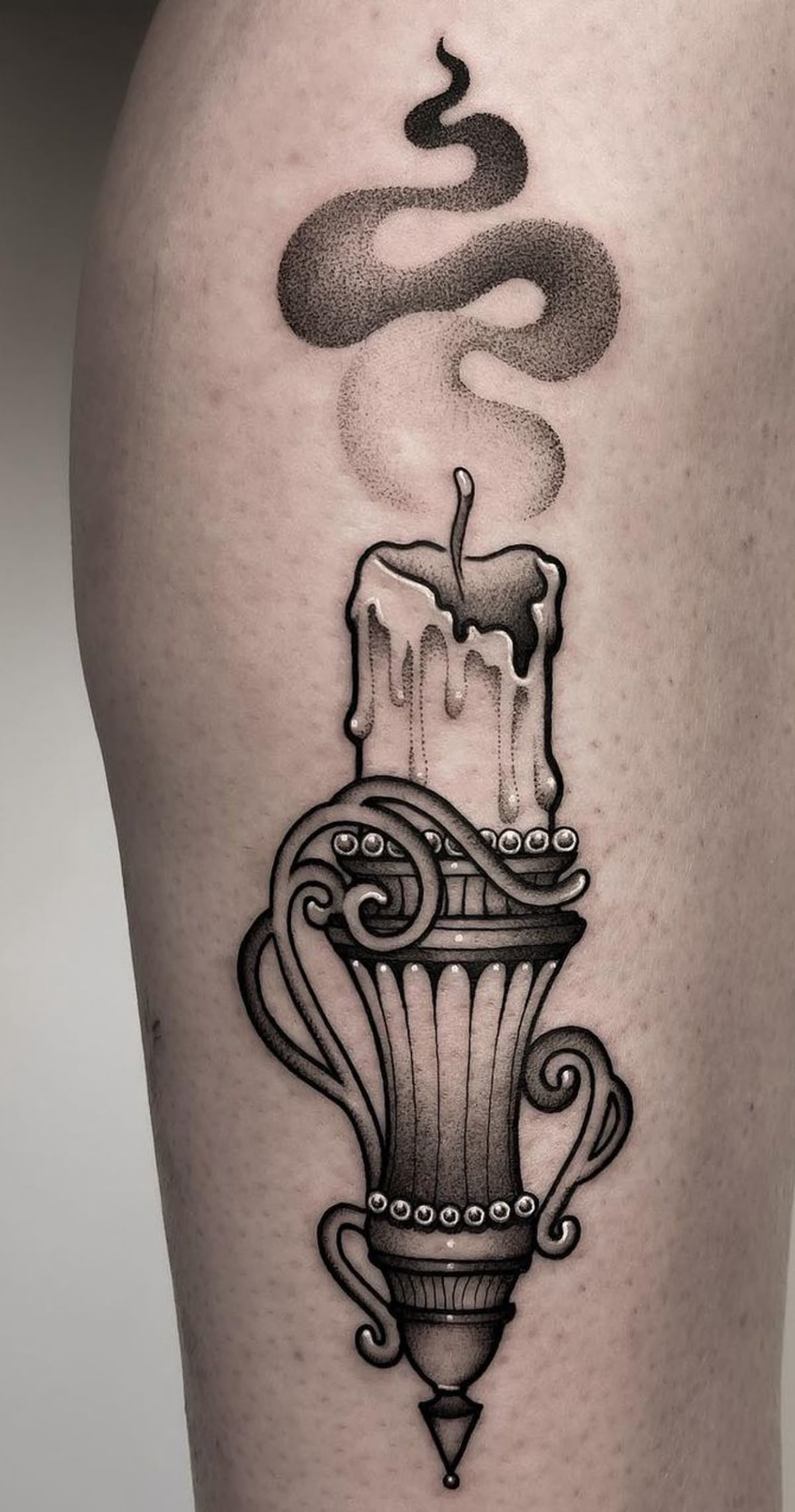 This candle tattoo proves that simple ideas can still be incredibly expressive. The minimal linework and gentle smoke give it a quiet, introspective feel, almost like a pause in a busy world. It feels personal, understated, and intentionally calm.