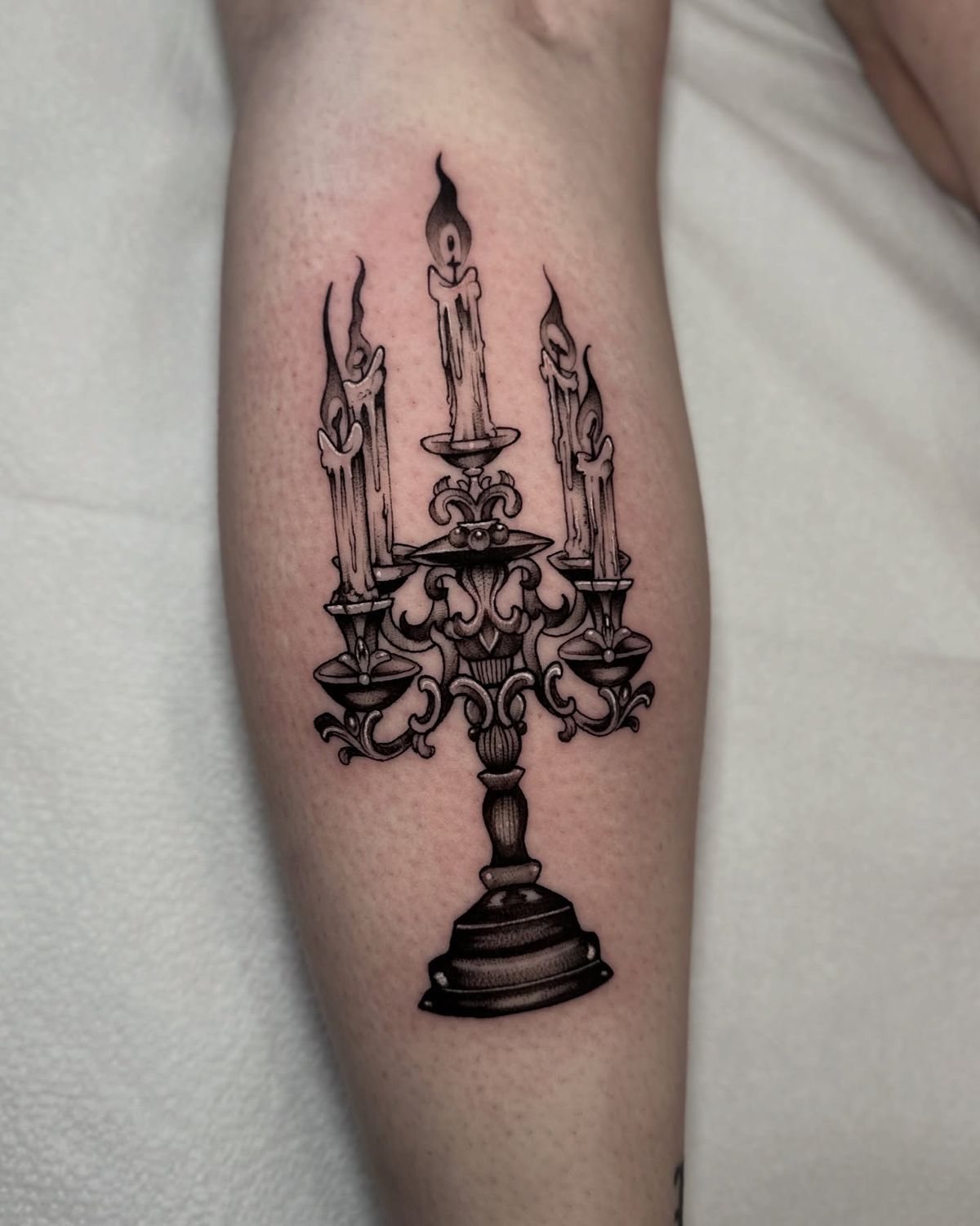 This candle tattoo feels ceremonial and powerful. The radiating lines around the flame give it a sense of importance, like a symbol rather than just an object. It carries a feeling of focus, clarity, and inner strength that feels quietly empowering.