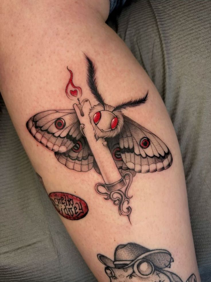 This Moth and candle composition feels mysterious in the most captivating way. The glowing red details create contrast against the darker tones, giving the tattoo a hypnotic, almost dreamlike mood. It suggests curiosity, transformation, and that irresistible pull toward light—even when it’s risky.