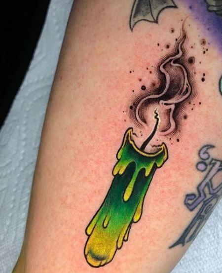 This Melting candle feels bold and expressive, almost rebellious. The vivid green wax dripping downward contrasts beautifully with the dark smoke, creating movement and emotion in a single glance. It’s the kind of tattoo that feels alive—unpredictable, creative, and full of personality.