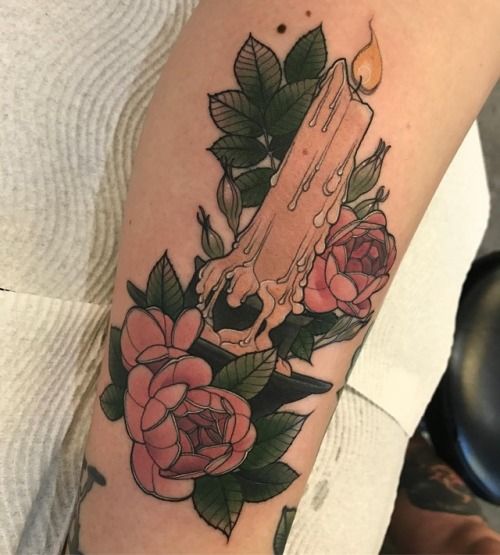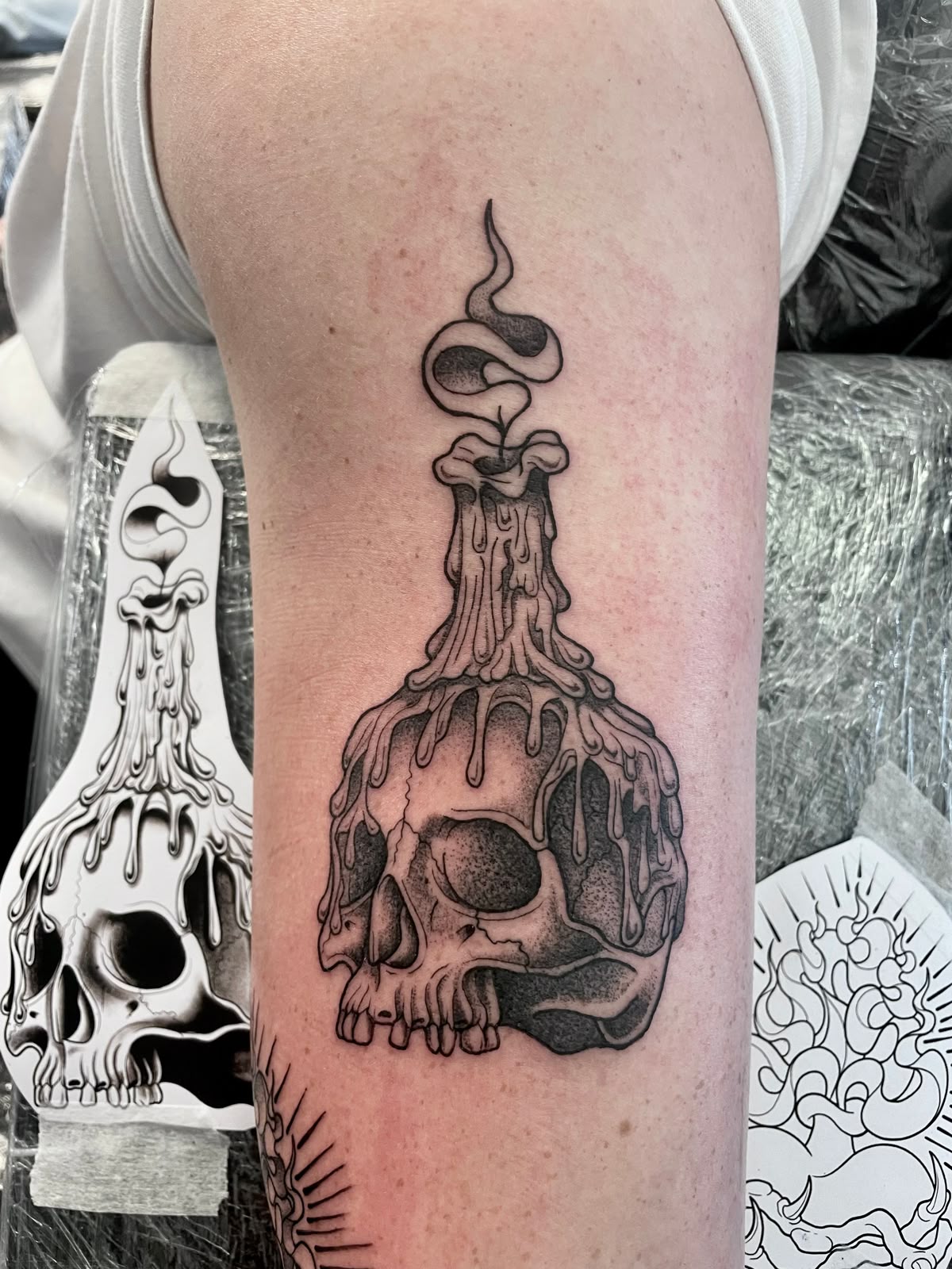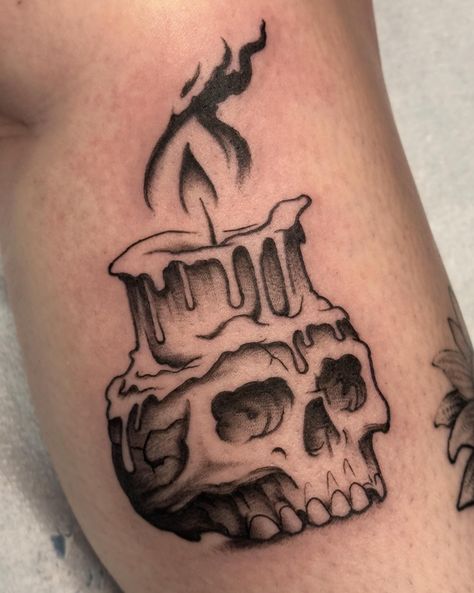 This candle tattoo leans into darker symbolism, blending life and mortality in a striking way. The Dripping wax over the skull feels poetic rather than scary, like a visual reminder that everything transforms. It has a strong emotional presence that feels honest and unapologetic.