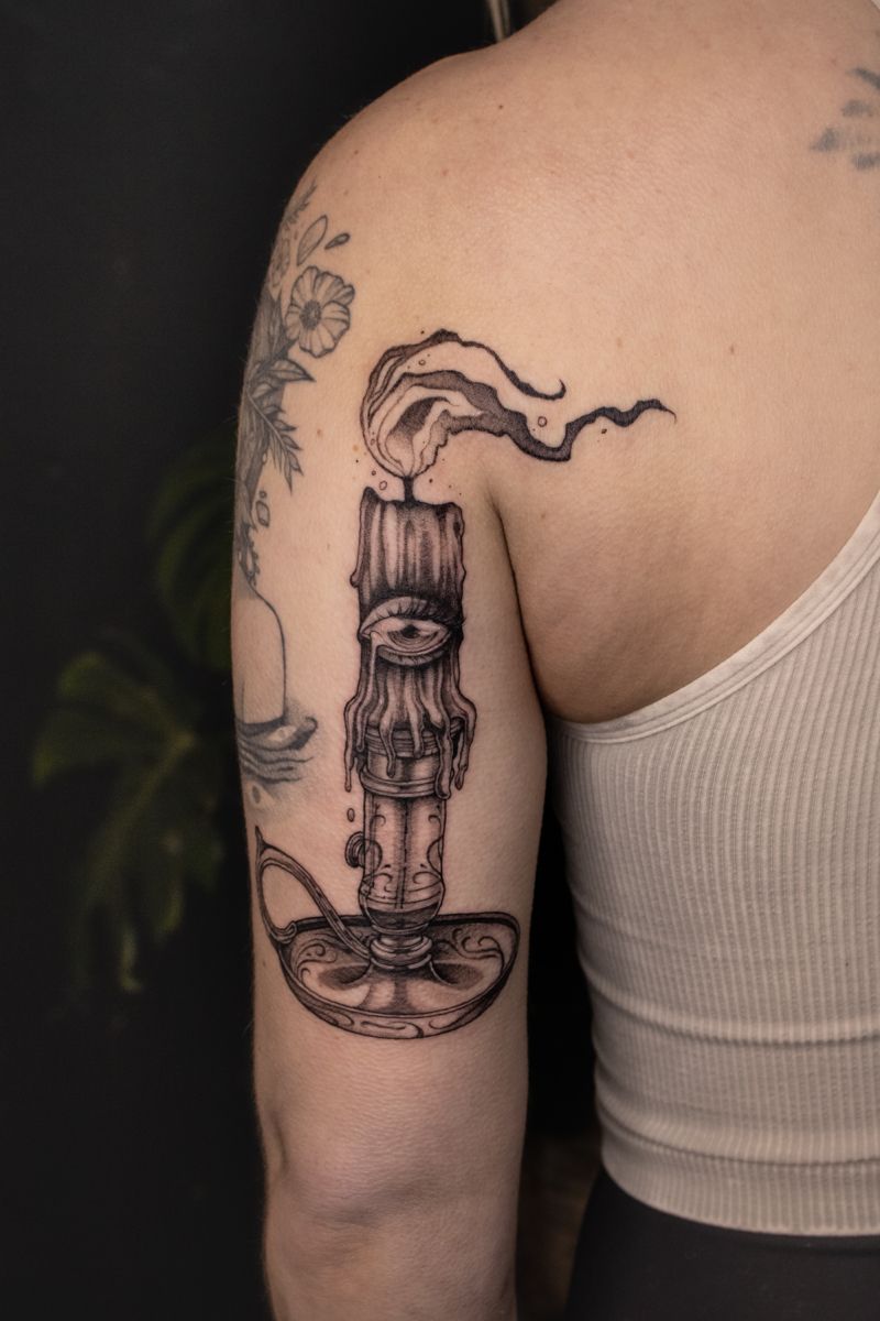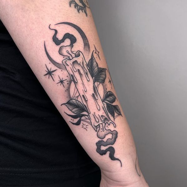 This tattoo feels like a quiet spell frozen in time. The Lit candle, curling smoke, and crescent moon create a Witchy atmosphere that’s calm rather than dramatic. It feels intuitive, personal, and softly powerful, like trusting your own inner light.