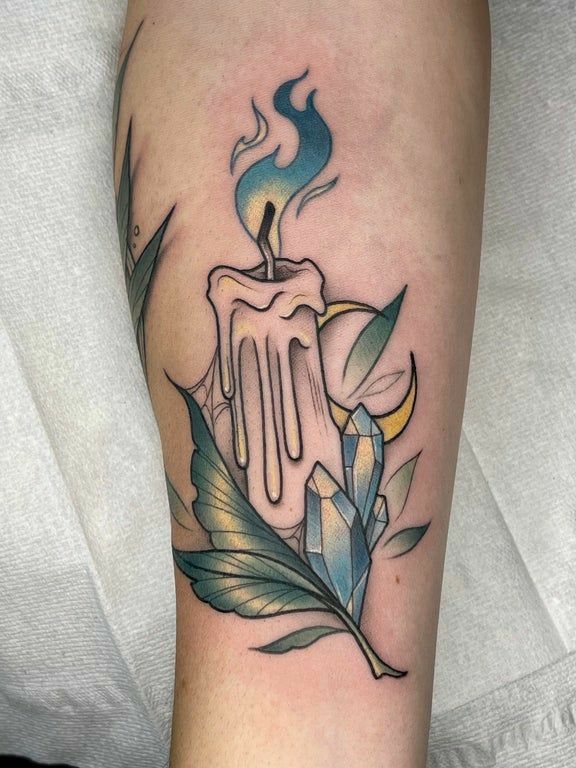 This candle tattoo feels gentle, calming, and quietly uplifting. The soft flame color paired with crystal elements gives it a healing, almost meditative energy. It feels less about darkness and more about balance, clarity, and intention.