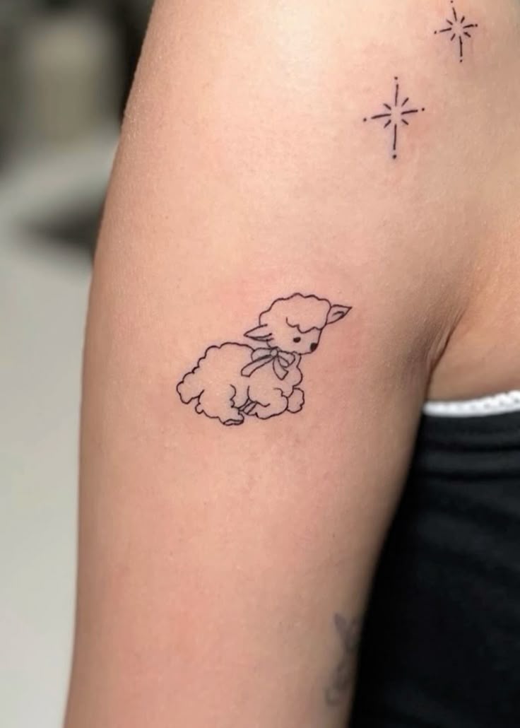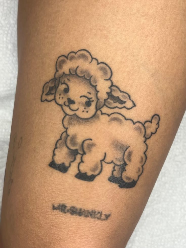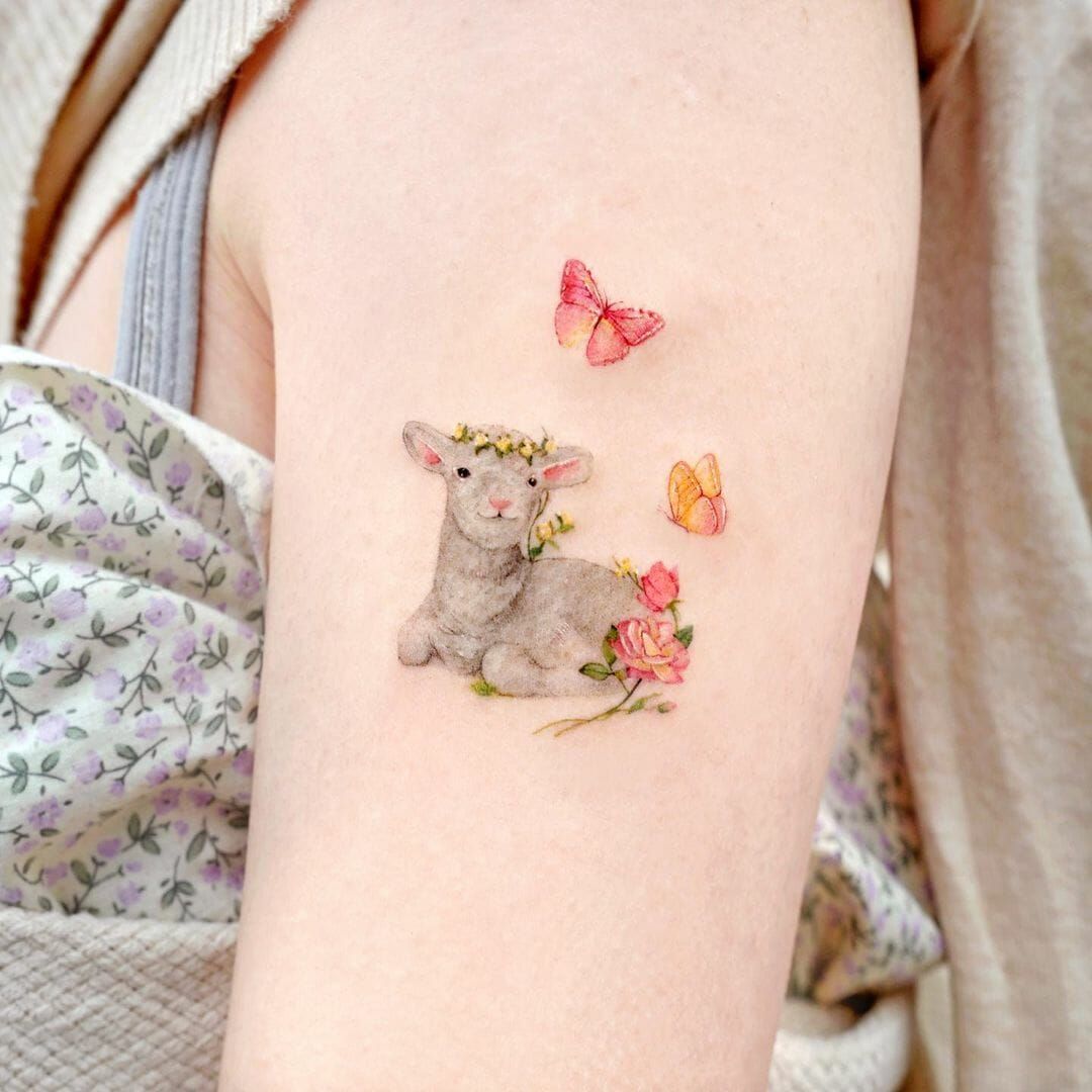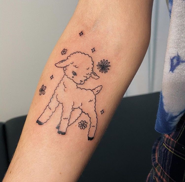 There’s something irresistibly soft about this cute little lamb, almost like it’s stepping right out of a storybook. The gentle pose, surrounded by tiny flowers and sparkles, gives it that dreamy, aesthetic charm that feels both youthful and quietly expressive. It’s the kind of tattoo that doesn’t shout for attention but instead invites a closer look, like a small secret you carry with you. It leans into cute energy without feeling overly childish, making it feel personal and meaningful.