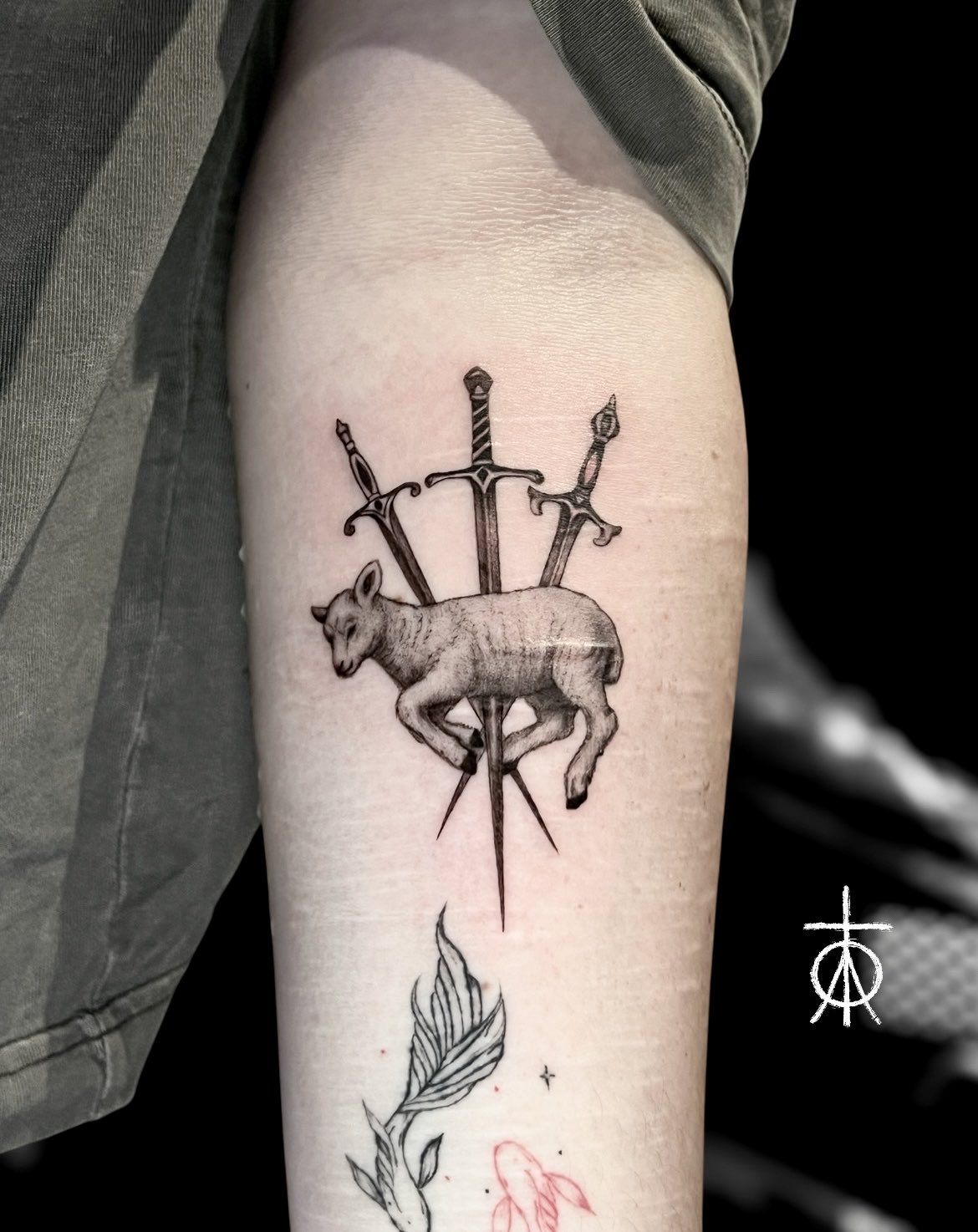 This design is striking—a lamb pierced by swords, blending innocence with intensity. It feels symbolic, almost like a story of sacrifice or resilience. There’s a dramatic edge here that makes it stand out from softer designs, leaning into something deeper and more emotional.